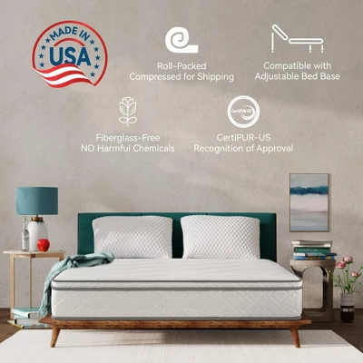Unbox comfort and support with our 10-inch hybrid mattress, featuring gel-infused memory foam for cooling relief and individually wrapped pocket coils for targeted, durable support. This innovative innerspring mattress offers breathability and longevity, ensuring a restful sleep experience. Designed for ultimate comfort, it combines the contouring of memory foam with the resilience of innerspring technology, all conveniently compressed in a box for easy setup.