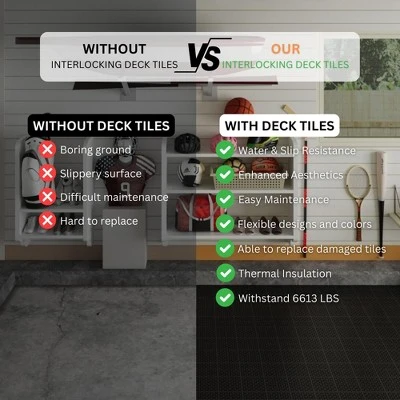 - EFFORTLESS SNAP CONNECTION: Our upgraded interlocking system enables quicker and more secure installation without tools, making these deck tiles perfect for outdoor flooring or patio tiles. Unlike other patio flooring, our snap design ensures a tighter connection between tiles, suitable for various spaces like your backyard or balcony. Additionally, these interlocking deck tiles can be easily disassembled in minutes, offering convenience for your patio flooring needs.