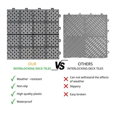 - EFFICIENT DRAINAGE DESIGN: Our innovative design enhances friction to prevent slipping, improving stability and firmness, making these deck tiles ideal for outdoor flooring or patio tiles. It prevents water accumulation and promotes airflow, ensuring a dry, safe, and hygienic surface, whether used in your backyard, balcony, or any outdoor space.