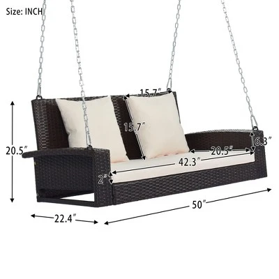 Introduce a touch of relaxation to your outdoor space with this elegant 2-person wicker hanging porch swing. Crafted from durable rattan, this swing bench offers both style and comfort for your garden, backyard, or beside a pond. It includes a plush cushion and a comfortable pillow for ultimate relaxation. The sturdy chains ensure safety and stability, allowing you to unwind peacefully while enjoying the beauty of nature. This hanging swing is perfect for enjoying a quiet morning with a book or a cozy evening under the stars.