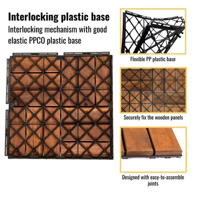 - Perfect Size: Each tile has a square shape of 12 inches x 12 inches with 0.75 inches thickness. The wood part is 0.47 inches thick and the plastic part is 0.28 inches thick enough for drainage during the rainy season.