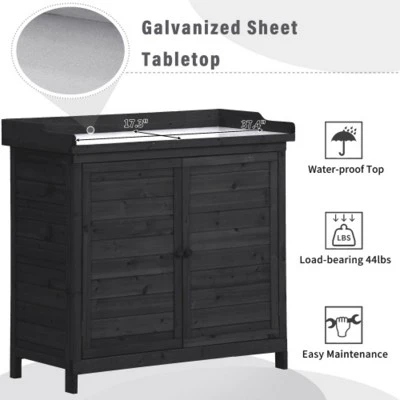 - [Ample 2-Tier Storage Cabinet] If you are a big fan of gardening, this potting bench will be a great choice. With 37.4″ total height, 2 ample storage shelves are designed to keep your tools handy and in one place without bending over or squatting. Constructed with a removable shelf, this potting table is ample enough for not only small tools but also extra soil, pots and other gardening supplies.