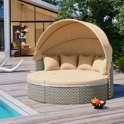 - [Versatile Comfort with a Retractable Canopy] Our round sectional sofa, which seamlessly transforms into an organized daybed, offers unparalleled versatility and comfort. The retractable canopy, easily fastened by straps, allows you to enjoy the sun or relax in the shade on your terms. This feature, coupled with the daybed’s curved design, invites you to lounge in secluded luxury or engage with guests in a unique outdoor setting.