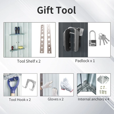 [Robust Construction] Nothing irks a garden hobbyist more than the sight of a collapsed shed. Luckily, this shed utilizes galvanized iron frames which greatly increase the overall sturdiness. On top of that, the galvanized steel panels, coated with eco-friendly painting, can endure harsh weather for at least 6 years.Product Highlights