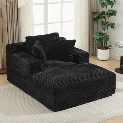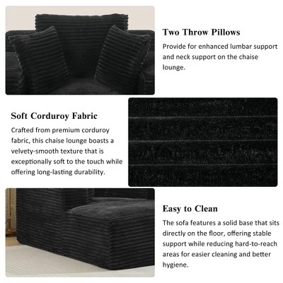 SummaryThis chaise lounge offers a spacious and comfortable seating experience with its wide design (47.2 inches deep and 48.8 inches wide), perfect for lounging, reading, or napping. Upholstered in luxurious corduroy fabric, it features a soft, plush texture with a timeless, vertical ribbed pattern. The wide, supportive armrests enhance both the comfort and style, while two soft throw pillows and a back cushion provide additional support for a customizable lounging experience. With its modern, all-compressed design, this lounge fits seamlessly into any living space, combining sleek aesthetics with functional comfort.Additional CushionsThis chaise lounge includes two soft throw pillows and one supportive back cushion, offering added comfort. The cushions can be arranged to suit your preferences, providing a personalized lounging experience.Deep SeatingThe full-foam sofa features deep seating, providing exceptional comfort and support for a truly relaxing experience.Product Details:Product TypeChaise Lounge SofaOverall DimensionOverall:48.8″D x66.1″W x 34.7″HProduct WeightOverall:88.18lbsPackage DimensionPlease see detailsPackage WeightPlease see detailsWeight Capacity(Per Seat)250lbsSeat Height- Floor to Seat16.7″Seat Deep- Front to Back47.2″Backrest Height – Seat to Top of the Backrest19.7″Pillow SizeThrow Pillow:13.8″*13.8″ColorGreyUpholstery MaterialCorduroy FabricFrame MaterialFoamSeat ConstructionPocket Springs+FoamLeg Material/Removable BackrestNoRemovable Backrest CoverNoRemovable CushionNoRemovable Cushion CoverNoFoam Density1.875 lbs./cu.ftNotes1.Product Care:Dust regularly. Clean gently with a clean, slightly damp cloth. Professional cleaning is recommended. Avoid direct sunlight. Never apply or clean with harsh chemicals.2.Assembly Required:5 Minutes.3.Chromatic Aberration:Manual measurement has been used, there may be some reasonable error. All the pictures are taken by actual samples, slight chromatic aberration may occur due to lighting or display.