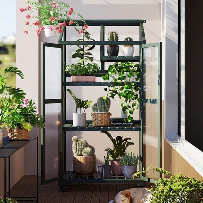 Grow plants year-round with this 62-inch wood greenhouse, designed for both indoor and outdoor use. The portable cold frame features locking wheels for easy relocation to balconies, gardens, or patios, while the anti-tipping strap ensures stability on any surface. Inside, three-tier shelves—two removable and one half-shelf—offer six adjustable levels (5.5-inch spacing) to accommodate seedlings, potted flowers, or taller plants. The durable fir wood frame and transparent polycarbonate panels protect against harsh weather, while the openable roof lets you customize ventilation with adjustable screws. Ideal for small-space gardening, this greenhouse combines flexibility and resilience, with simple assembly and marked parts for hassle-free setup. Perfect for nurturing plants in any season, it’s a versatile addition to any home garden or indoor space.
