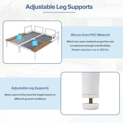 - [Adjustable Leg Supports] The base of this daybed is woven from PVC material, which has wear-resistant properties and exceptional strength and flexibility. Each individual daybed is reinforced by five sturdy iron leg supports and its weight capacity is up to 350 lbs. The adjustable leg supports allow users to fine-tune the height based on different ground conditions. The iron frame and iron legs ensure the stability and long-term use.