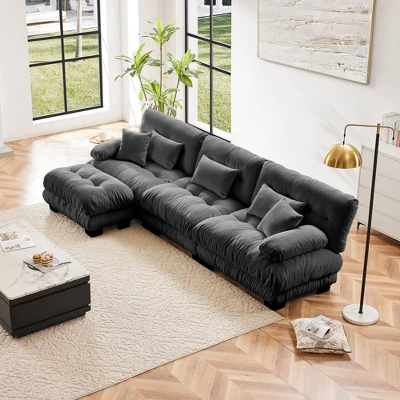 This elegant sofa features soft, durable vintage chenille fabric, offering year-round comfort and style. Its rounded bolster armrests provide both aesthetic appeal and supportive comfort for your arms and head. The cloud-like seat cushions, filled with high-resilient sponge and cotton, deliver exceptional support and a plush seating experience. The deep seat design and included throw and waist pillows enhance comfort further. With a modular and flexible layout, it can be customized to fit any space.