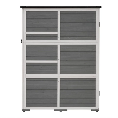 Keep your outdoor space tidy with this rugged wood storage shed, designed to protect tools and supplies from the elements. The waterproof asphalt roof and water-resistant coating shield contents from rain, while four lockable doors with magnetic closures ensure security. Inside, multi-tier shelves—including three half-sized compartments—organize shovels, rakes, and small accessories, with customizable hook strips (not included) for extra versatility. Built with durable fir wood and OSB board, reinforced corners, and adjustable feet, it withstands heavy use on patios, gardens, or driveways. The rustic design blends seamlessly with outdoor decor, while pre-drilled holes and clear instructions simplify assembly. Ideal for year-round storage, this shed offers weatherproof durability and organized convenience for all your gardening essentials.