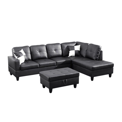 Experience luxury and comfort with our modern L-shaped sectional sofa crafted from premium faux leather, complete with a chaise lounge and ottoman for ultimate relaxation.